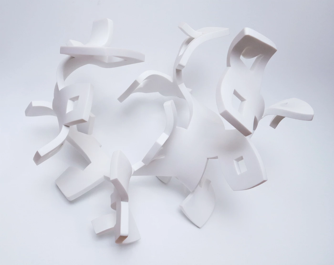 El proceso de Windows comienza con una investigación en papel y cartón, recortando y plegando hasta encontrar la forma adecuada. Después, repite la secuencia varias veces para memorizarla, como si se tratara de una coreografía. Una vez calentada la plancha de Corian en un horno industrial, dispone de apenas cinco minutos para ejecutar esa coreografía de pliegues antes de que el material se enfríe y la forma quede fijada. Ese instante, donde gesto, tiempo y materia coinciden, concentra el núcleo conceptual de la serie.