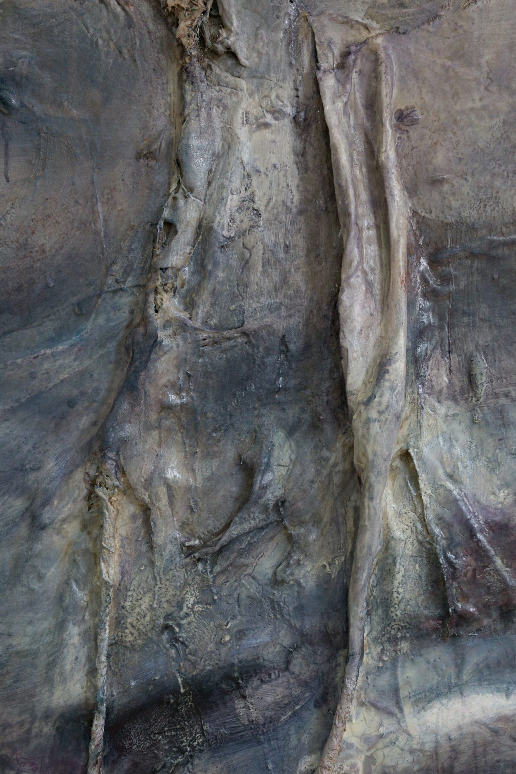Las pinturas de Quiroz trabajan desde la acumulación lenta: capas de óleo, veladuras, texturas densas que construyen figuras híbridas donde lo orgánico, lo tecnológico, y lo espiritual conviven sin jerarquías claras. No hay una voluntad de ilustrar discursos teóricos, sino de sostenerlos pictóricamente. La identidad aparece como algo que se construye y se deshace, no como una categoría fija.