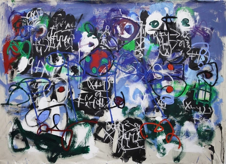 Taher Jaoui is an artist who stands out for his ability to organize certain forms or patterns in an apparently random manner, materializing it in a controlled representation of chaos. The act of painting and the plastic qualities of the materials used come together to capture a rich and intense creative process. The artist fuses abstract expressionism, primitive African art, graffiti, and pop culture to create a unique visual language that challenges academic conventions. Influenced by Jean-Michel Basquiat, Jean Dubuffet, and the aesthetics of neo-expressionism, his works oscillate between chaos and order, integrating gestural strokes, layers of vibrant color, and mathematical symbols. In his series, from the monochromatic "Black and White," which evokes mathematical schemes, to the neo-figurative "Caartoons," where cartoony shapes and saturated colors construct visual narratives, Jaoui connects emotions and reflection in a language that combines the logic of calculation with creative spontaneity.