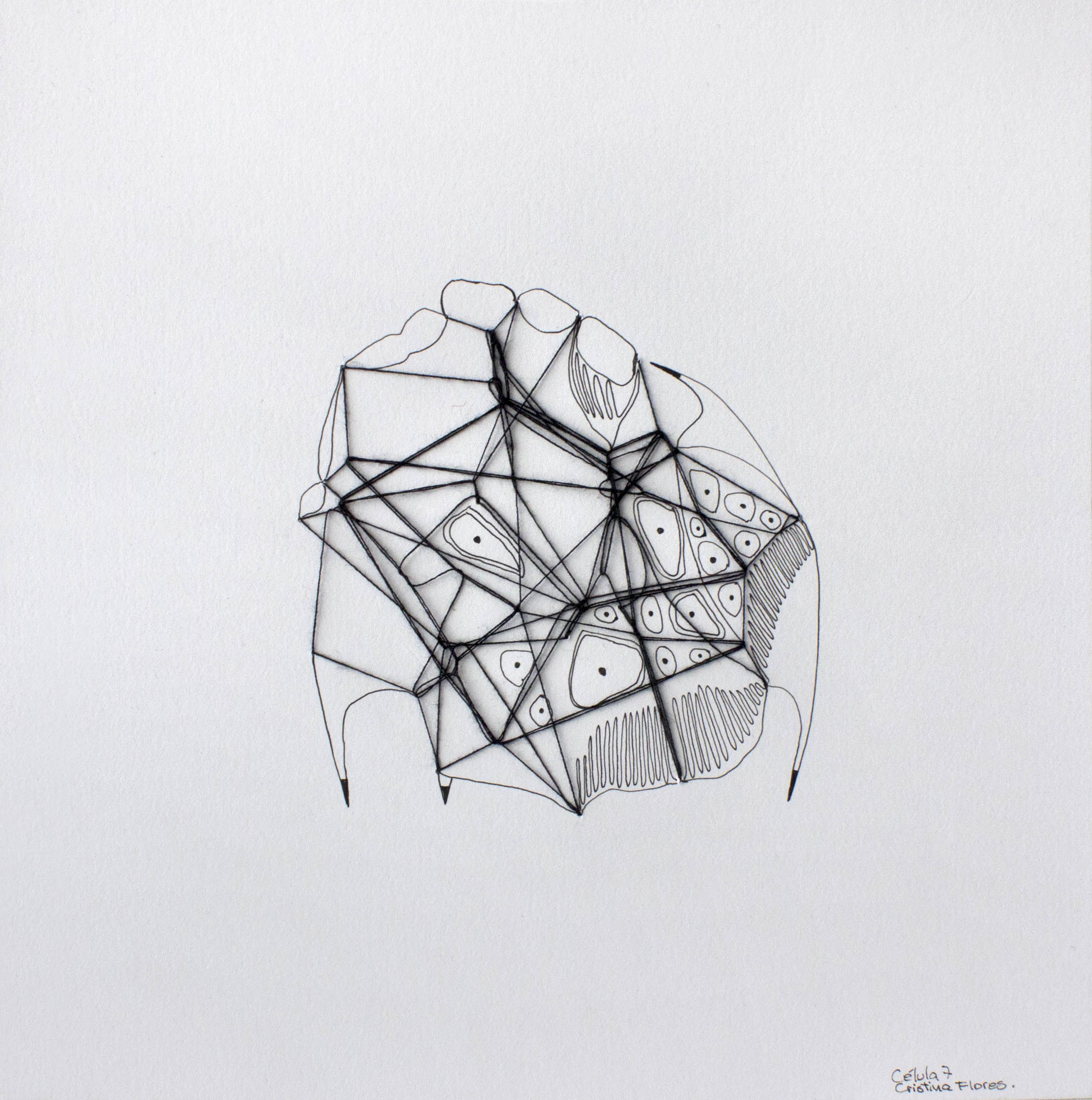 ¿Dónde reside el amor? Siempre se ha pensado que el órgano que lo «contiene» es el corazón. Célula 7 es una obra realizada en dibujo con tinta y aplicaciones con hilo negro, muy próxima a la forma de un corazón, pero no exactamente. Es un organismo misterioso en estado de alerta, y necesidad por seguir creciendo. Se estira desde su posición y ante su presencia surge la pregunta ¿Dónde lo encontramos y en qué se convertirá? Célula 7 nos llama a mirarnos a nosotros mismos, a redescubrirnos desde lo pequeño que nos construye.