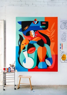 La obra de Rubén Sánchez destaca por una construcción formal rigurosa, donde el equilibrio compositivo no es simplemente una búsqueda estética, sino una estructura conceptual que articula la totalidad de su lenguaje visual. Su aproximación autodidacta ha derivado en una gramática plástica depurada, en la que formas biomórficas, geometrías fragmentadas y paletas cromáticas de alta saturación se integran con precisión matemática en el espacio pictórico. Sánchez domina con solvencia la tensión entre simetría y asimetría, generando un ritmo visual que guía al espectador a través de narrativas implícitas, muchas veces apoyadas en referencias simbólicas o mitológicas de raíz mediterránea. Su calidad técnica reside en la capacidad de resolver obras complejas con una economía de elementos visuales que, lejos de diluir la expresividad, potencian la legibilidad formal y la fuerza comunicativa de sus piezas. Esta solidez compositiva se extiende tanto en formatos murales como en obra sobre lienzo o cerámica, configurando un cuerpo de trabajo coherente, de identidad estilística consolidada y proyección internacional creciente.