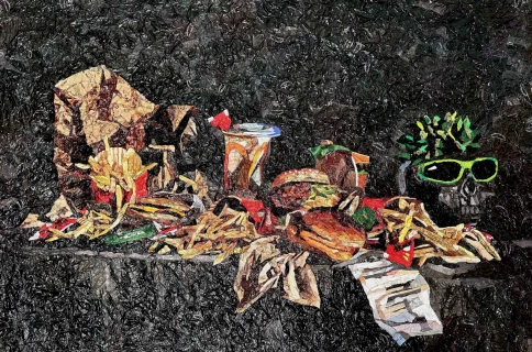 La práctica artística de Pablo Llana se construye desde una mirada crítica y profundamente documentada sobre los excesos del sistema capitalista. Su obra parte de una investigación de campo en torno a la cultura del consumo y el desecho, abordando fenómenos contemporáneos como la obesidad, la globalización o la neo-colonización. Con una ironía aguda y sutil, Llana convierte envoltorios de comida ultraprocesada en materia prima para composiciones visuales que evidencian la contradicción entre atractivo comercial y degradación social. Mediante un proceso meticuloso de recolección y reciclaje, el artista transforma el packaging de productos alimenticios en imágenes que funcionan como espejos de nuestras dinámicas de consumo. Su obra, con un lenguaje directo pero cargado de lecturas múltiples, se despliega en formatos diversos que oscilan entre la instalación, el collage y la escultura. Originario de Tijuana, frontera viva entre México y Estados Unidos, Llana ha convertido su contexto geopolítico en una motivación central de su producción. Su trabajo ha sido expuesto en ciudades como Ciudad de México, Oaxaca, Monterrey, así como en Estados Unidos, Italia y Alemania. Actualmente, su obra forma parte de la colección permanente del Centro Cultural Tijuana (CECUT).