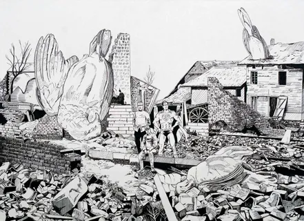 Óscar Seco desarrolla una práctica pictórica crítica que subvierte los relatos históricos, políticos y sociales mediante una iconografía híbrida que combina tradición bélica, estética del cómic e imaginario apocalíptico. Sus composiciones, densas y narrativas, integran referencias históricas y escenarios distópicos con una estructura visual fragmentada y cargada de simbolismo. Formalmente, conjuga dibujo riguroso con elementos paródicos y grotescos, generando una tensión entre artificio y contenido. Su manejo cromático alterna entre paletas saturadas y blancos y negros, siempre en función del discurso visual. Conceptualmente, su obra opera desde el revisionismo simbólico, cuestionando las mitologías del poder, la memoria colectiva y la violencia estructural mediante ironía, apropiación y anacronismo.