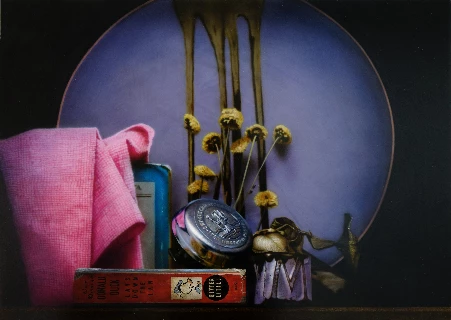El plato violeta actúa como un halo o una luna estática, un círculo de perfección geométrica que enmarca la decadencia de las flores.
