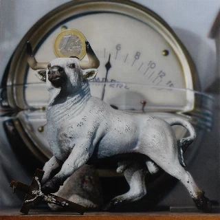 En el primer plano, un toro blanco de juguete, una referencia que remite al mito de Europa, la princesa fenicia que fue raptada por Zeus en forma de un toro. Este poderoso símbolo de fertilidad y abundancia cobra vida a través de la inocencia del juguete, sugiriendo que la esencia de este mito ha sido dulcificada hasta convertirse en una mera curiosidad. Sobre la cabeza del toro, una moneda de un euro brilla tenuemente, un símbolo del consumismo y la economía que ha moldeado la cultura europea contemporánea. Esta presencia monetaria plantea interrogantes sobre el verdadero valor de lo que representa Europa hoy: una tierra enriquecida por su historia, pero cuya esencia puede estar amenazada por los intereses materiales.
