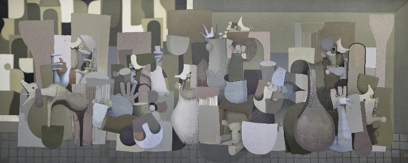político, es un documento evidente de la sinrazón humana. La composición funciona como un friso contemporáneo, un campo saturado de formas que se rozan, se obstaculizan y se protegen. Hay indicios de cuerpos, rostros y restos de objetos cotidianos. Desde el punto de vista técnico, destaca la construcción por planos superpuestos, la sensación de collage pictórico que mantiene todo en un sutil equilibrio. La paleta, contenida y opaca, rehúye la espectacularidad, los tonos se apagan como si llevaran polvo, humo o tiempo encima.