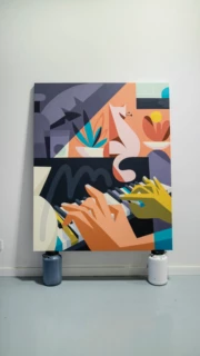 La obra de Rubén Sánchez destaca por una construcción formal rigurosa, donde el equilibrio compositivo no es simplemente una búsqueda estética, sino una estructura conceptual que articula la totalidad de su lenguaje visual. Su aproximación autodidacta ha derivado en una gramática plástica depurada, en la que formas biomórficas, geometrías fragmentadas y paletas cromáticas de alta saturación se integran con precisión matemática en el espacio pictórico. Sánchez domina con solvencia la tensión entre simetría y asimetría, generando un ritmo visual que guía al espectador a través de narrativas implícitas, muchas veces apoyadas en referencias simbólicas o mitológicas de raíz mediterránea. Su calidad técnica reside en la capacidad de resolver obras complejas con una economía de elementos visuales que, lejos de diluir la expresividad, potencian la legibilidad formal y la fuerza comunicativa de sus piezas. Esta solidez compositiva se extiende tanto en formatos murales como en obra sobre lienzo o cerámica, configurando un cuerpo de trabajo coherente, de identidad estilística consolidada y proyección internacional creciente.