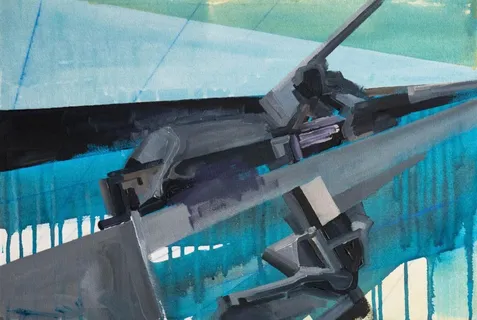 El artista mexicano Hugo Robledo investiga en su obra las fronteras entre figuración y abstracción y sus composiciones pictóricas provienen a menudo de viejas enciclopedias ilustradas y de Internet, de donde extrae imágenes referentes a plantas arquitectónicas, esquemas técnicos, medios de transporte y tecnologías en desuso. El derrumbe del futuro es un proyecto en el que ha trabajado a lo largo de varios años y en el que combina un lenguaje abstracto y geométrico con la reflexión sobre las ideas de arquitectura, espacio, progreso y nostalgia, que ponen de manifiesto las tensiones contradictorias de la época en que vivimos.