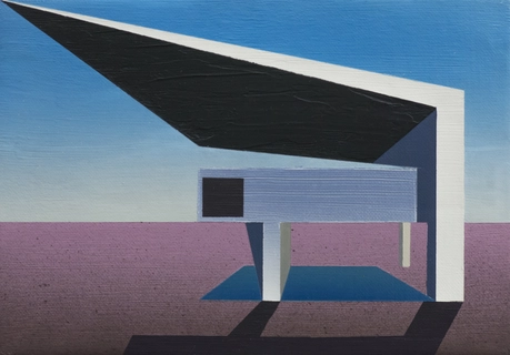El artista mexicano Hugo Robledo investiga en su obra las fronteras entre figuración y abstracción y sus composiciones pictóricas provienen a menudo de viejas enciclopedias ilustradas y de Internet, de donde extrae imágenes referentes a plantas arquitectónicas, esquemas técnicos, medios de transporte y tecnologías en desuso. El derrumbe del futuro es un proyecto en el que ha trabajado a lo largo de varios años y en el que combina un lenguaje abstracto y geométrico con la reflexión sobre las ideas de arquitectura, espacio, progreso y nostalgia, que ponen de manifiesto las tensiones contradictorias de la época en que vivimos.