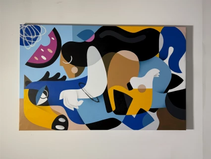 La obra de Rubén Sánchez destaca por una construcción formal rigurosa, donde el equilibrio compositivo no es simplemente una búsqueda estética, sino una estructura conceptual que articula la totalidad de su lenguaje visual. Su aproximación autodidacta ha derivado en una gramática plástica depurada, en la que formas biomórficas, geometrías fragmentadas y paletas cromáticas de alta saturación se integran con precisión matemática en el espacio pictórico. Sánchez domina con solvencia la tensión entre simetría y asimetría, generando un ritmo visual que guía al espectador a través de narrativas implícitas, muchas veces apoyadas en referencias simbólicas o mitológicas de raíz mediterránea. Su calidad técnica reside en la capacidad de resolver obras complejas con una economía de elementos visuales que, lejos de diluir la expresividad, potencian la legibilidad formal y la fuerza comunicativa de sus piezas. Esta solidez compositiva se extiende tanto en formatos murales como en obra sobre lienzo o cerámica, configurando un cuerpo de trabajo coherente, de identidad estilística consolidada y proyección internacional creciente.