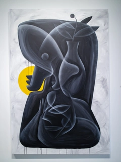 La obra de Rubén Sánchez destaca por una construcción formal rigurosa, donde el equilibrio compositivo no es simplemente una búsqueda estética, sino una estructura conceptual que articula la totalidad de su lenguaje visual. Su aproximación autodidacta ha derivado en una gramática plástica depurada, en la que formas biomórficas, geometrías fragmentadas y paletas cromáticas de alta saturación se integran con precisión matemática en el espacio pictórico. Sánchez domina con solvencia la tensión entre simetría y asimetría, generando un ritmo visual que guía al espectador a través de narrativas implícitas, muchas veces apoyadas en referencias simbólicas o mitológicas de raíz mediterránea. Su calidad técnica reside en la capacidad de resolver obras complejas con una economía de elementos visuales que, lejos de diluir la expresividad, potencian la legibilidad formal y la fuerza comunicativa de sus piezas. Esta solidez compositiva se extiende tanto en formatos murales como en obra sobre lienzo o cerámica, configurando un cuerpo de trabajo coherente, de identidad estilística consolidada y proyección internacional creciente.