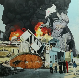 Óscar Seco desarrolla una práctica pictórica crítica que subvierte los relatos históricos, políticos y sociales mediante una iconografía híbrida que combina tradición bélica, estética del cómic e imaginario apocalíptico. Sus composiciones, densas y narrativas, integran referencias históricas y escenarios distópicos con una estructura visual fragmentada y cargada de simbolismo. Formalmente, conjuga dibujo riguroso con elementos paródicos y grotescos, generando una tensión entre artificio y contenido. Su manejo cromático alterna entre paletas saturadas y blancos y negros, siempre en función del discurso visual. Conceptualmente, su obra opera desde el revisionismo simbólico, cuestionando las mitologías del poder, la memoria colectiva y la violencia estructural mediante ironía, apropiación y anacronismo.