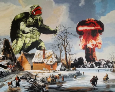 Óscar Seco desarrolla una práctica pictórica crítica que subvierte los relatos históricos, políticos y sociales mediante una iconografía híbrida que combina tradición bélica, estética del cómic e imaginario apocalíptico. Sus composiciones, densas y narrativas, integran referencias históricas y escenarios distópicos con una estructura visual fragmentada y cargada de simbolismo. Formalmente, conjuga dibujo riguroso con elementos paródicos y grotescos, generando una tensión entre artificio y contenido. Su manejo cromático alterna entre paletas saturadas y blancos y negros, siempre en función del discurso visual. Conceptualmente, su obra opera desde el revisionismo simbólico, cuestionando las mitologías del poder, la memoria colectiva y la violencia estructural mediante ironía, apropiación y anacronismo.